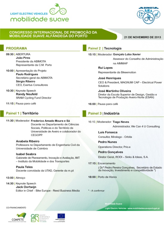 Posicionar o cluster da mobilidade entre os mais competitivos do mundo e promover Portugal enquanto plataforma especializada de competências ao longo de toda a cadeia da mobilidade são dois dos objetivos deste projeto, em que se insere o congresso, o qual reuniráespecialistas em planeamento do território – que procurarão responder a questões como“De que forma as nossas cidades estão preparadas ou como poderão preparar-se para adotar a mobilidade suave em crescimento na Europa?” e“Quais os principais desafios para as autarquias?” –,empreendedores com empresas e projetos na área da tecnologia para a mobilidade – uma área de negócio em crescimento –,e responsáveis das empresas de produção de componentes e na montagem de bicicletas e motociclos elétricos, que debaterão o estado atual e o futuro da indústria.