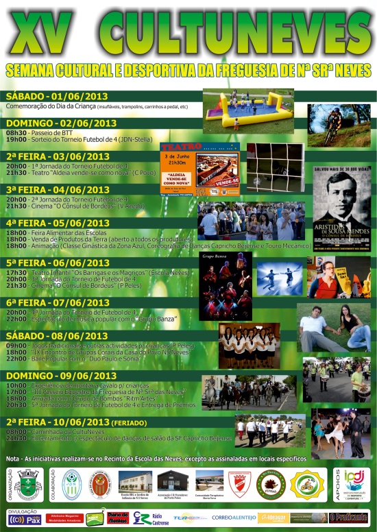 Inicia-se no próximo dia 01 de Junho, mais uma edição da semana cultural e desportiva da Freguesia de Nª Srª das Neves (Beja), a “XV CultuNeves”, que nesta edição decorrerá até 10 de Junho de 2013 e cujos eventos se realizarão no Largo da Escola, salvo algumas iniciativas específicas que decorrerão noutros locais da freguesia, cujo programa este ano prevê a realização de vinte iniciativas, das quais dezasseis são culturais e quatro desportivas.