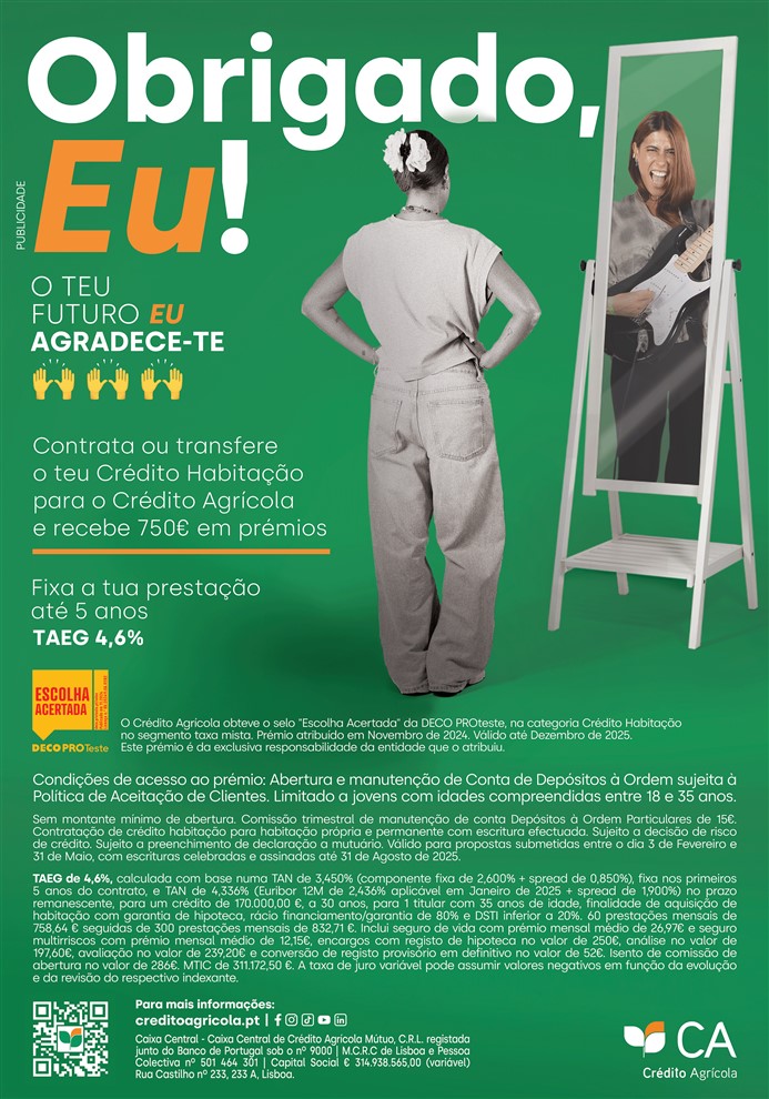 O Crédito Agrícola acaba de lançar a iniciativa "Obrigado, Eu!", direccionada a jovens entre os 18 e os 35 anos que pretendem contratar ou transferir o seu Crédito Habitação para o Crédito Agrícola, com o objectivo de os capacitar nesta nova fase da vida e os ajudar a concretizar o sonho de comprar finalmente a sua própria casa.