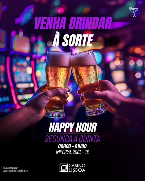 Venha brindar à sorte e aproveite a “Happy Hour”, de segunda a quinta-feira, entre as 00h00 e as 01h00, com imperiais de 20cl, por apenas 1€, no Arena Lounge, Play Bar e Baccarat Bar.