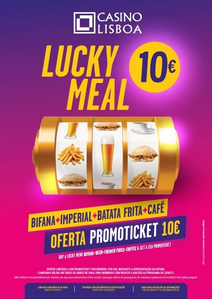 O Casino Lisboa lançou, ainda, a campanha “Lucky Meal” que está disponível, diariamente, no Play Bar e Baccarat Bar. Os clientes que escolherem o menu “Lucky Meal” que inclui (bifana, imperial, batata frita e café), por apenas 10€, poderão usufruir da oferta de um promoticket no valor de 10€.