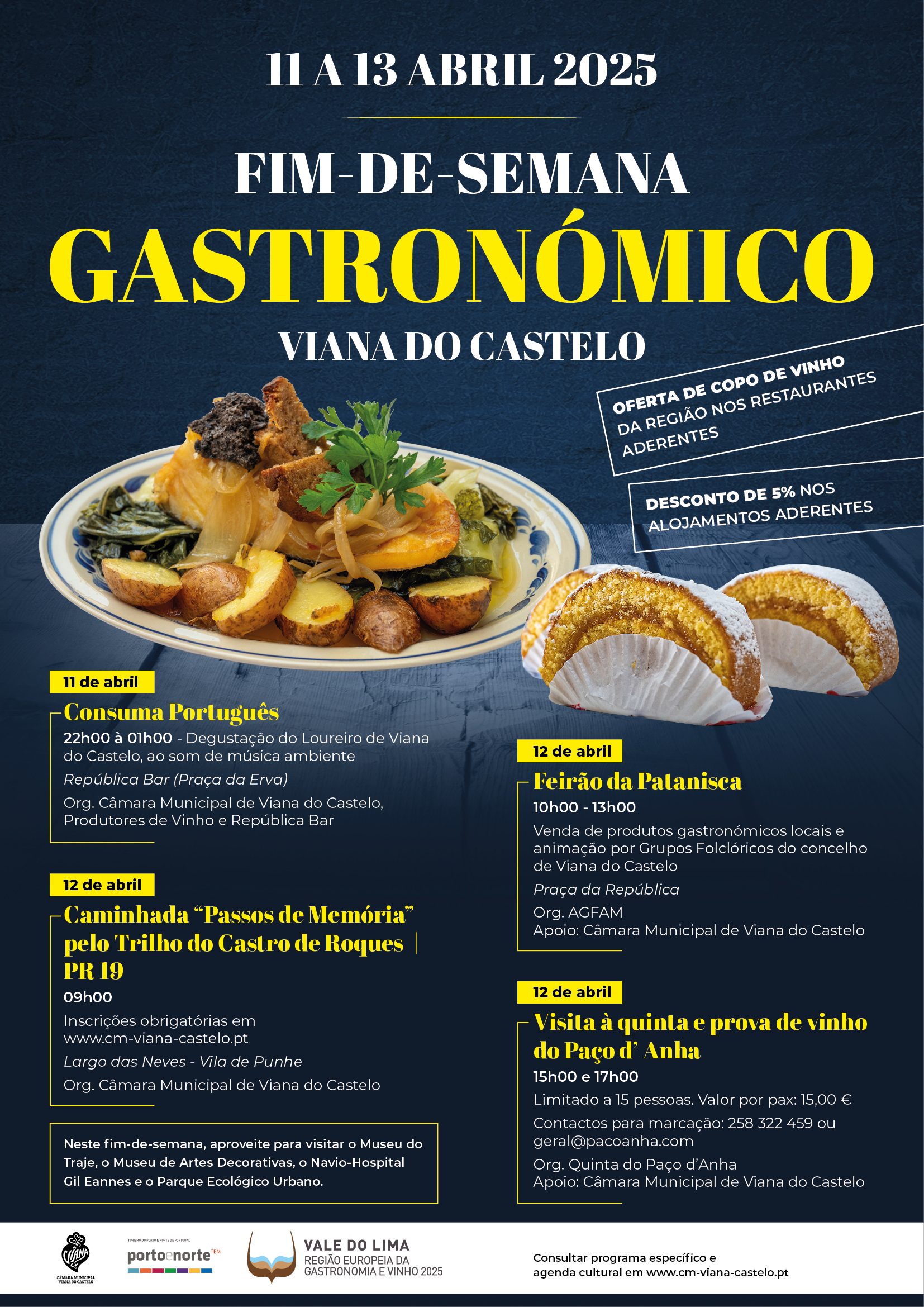 Entre os dias 11 e 13 de abril, a Câmara Municipal de Viana do Castelo, em colaboração com a Entidade Regional do Turismo do Porto e Norte de Portugal e em parceria com as empresas de restauração e alojamentos turísticos aderentes, promove o Fim-de-semana Gastronómico de Viana do Castelo, evento integrado no programa “Vale do Lima – Região Europeia da Gastronomia e Vinho 2025”.