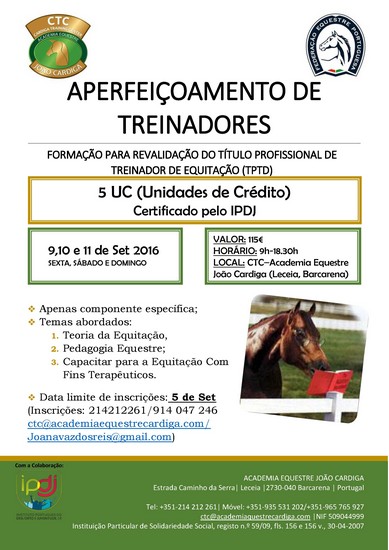 Estão abertas inscrições para a 2ª edição do Curso “Aperfeiçoamento de Treinadores”, a realizar no Cardiga Training Center, da Academia Equestre João Cardiga, em Leceia, Oeiras, dias 9, 10 e 11 de Setembro de 2016.