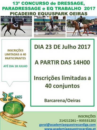 A Academia Equestre João Cardiga, organiza mais um concurso inclusivo, nas disciplinas de Dressage, Paradressage e Equitação de Trabalho, dia 23 de Julho de 2017, a partir das 14h00.