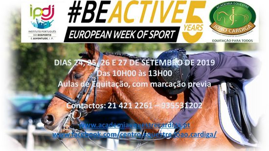 De 24 a 27 de Setembro 2019, das 10h00 às 13h00, em Barcarena – Oeiras, a Academia Equestre João Cardiga-AEJC, através do programa “Equitação Para Todos” vai proporcionar experiencias a cavalo (volteio) e aulas de equitação avançadas, no âmbito da 5ª edição da Semana Europeia do Desporto #BEACTIVE 5.