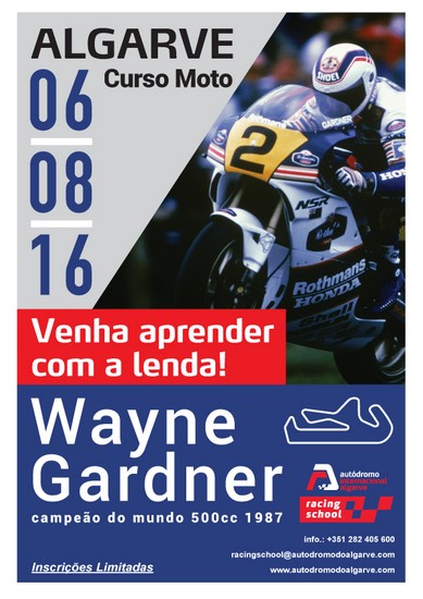 No próximo dia 6 de Agosto a AIA Racing School, escola de condução avançada com sede no Autódromo Internacional do Algarve promove um curso de condução desportiva avançada moto onde o principal monitor será o australiano Wayne Gardner, ex-campeão do mundo de 500cc. Um curso que se destina a quem já tem experiência de condução rápida em pista, nomeadamente pilotos, e também a amadores já com um nível de pilotagem alto e que procuram evoluir a sua rapidez sob os ensinamentos de uma lenda.