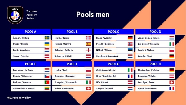 A dupla João Pedrosa/Hugo Campos, que vai representar o nosso País no Campeonato da Europa de Seniores em Voleibol de Praia, a realizar em Haia, Arnhem e Apeldoorn, nos Países Baixos, entre os dias 14 e 18 de Agosto de 2024, conheceu hoje os seus adversários.