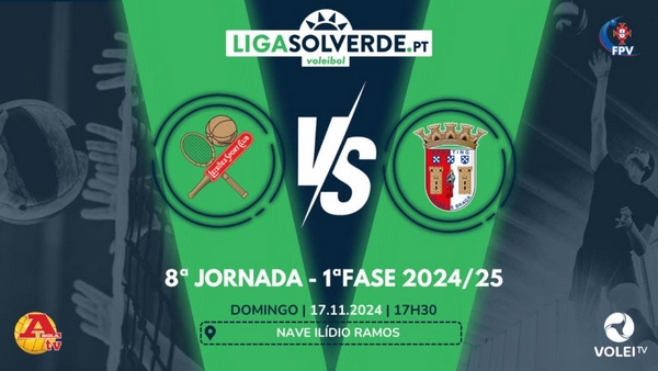 Na 8.ª jornada da Liga Solverde.pt, o SC Braga vai a Matosinhos defender a sua liderança, em jogo que será transmitido em directo na Volei TV e n’A Bola TV, enquanto o FC Porto, 2.º classificado com o mesmo número de vitórias e de pontos das bracarenses, recebe o GC Vilacondense, a única equipa que ainda não venceu qualquer jogo.