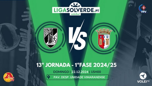 O dérbi minhoto Vitória SC x SC Braga, da 13.ª jornada da 1.ª Fase da Liga Solverde.pt, será transmitido em directo na Volei TV e n’A Bola TV.