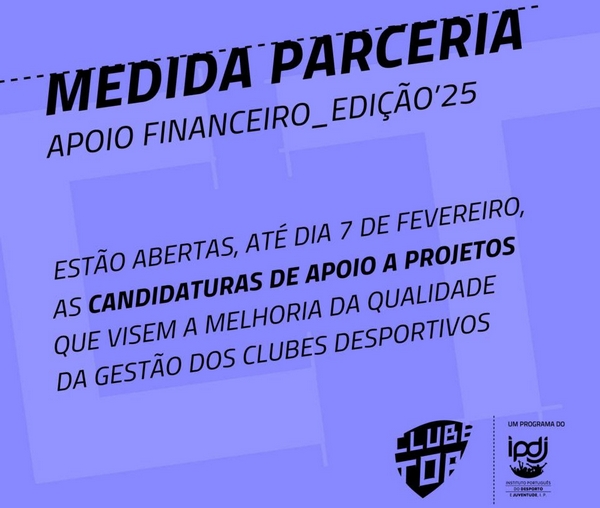 Estão abertas, até 7 de Fevereiro, as candidaturas à edição 2025 da «Medida Parceria» do Programa CLUBE TOP, iniciativa do Instituto Português do Desporto e Juventude (IPDJ) que visa “explorar o potencial transformador do programa, apoiando financeiramente e institucionalmente projetos que melhorem o desempenho dos clubes desportivos”.