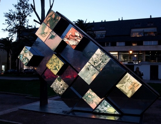 A monumental peça em aço espelhado e aço corten, com fotografias sobre acrílico retro-iluminado e luz, funciona como uma caixa de Pandora, simbolizando a Acção do tempo e a forma como perdura, enquanto, dentro de cubos em aço espelhado, no qual se reflectem os espectadores como potenciais intervenientes directos das acções, as imagens desenhadas reflectem sobre os grandes desastres ambientais e sociais produzidos pelo homem.
