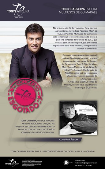 Tony Carreira esgota Multiusos de GuimarãesPublicado em quarta-feira, 15 de fevereiro de 2017 | Imprimir fShare Tweet Anterior Seguinte