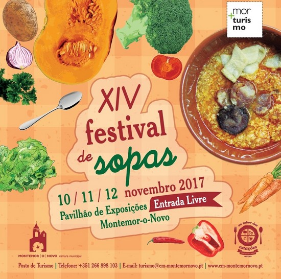 A 14.ª edição do Festival de Sopas realiza-se nos dias 10, 11 e 12 de Novembro, no Pavilhão de Exposições de Montemor-o-Novo. Da Sopa de peixe à Canja de Galinha, da Sopa da Horta ao Caldo Verde, da Sopa de Feijão com Couve à Sopa de Mogango, são mais de 50 sopas no Pavilhão de Exposições, sendo a seleção a principal dificuldade.