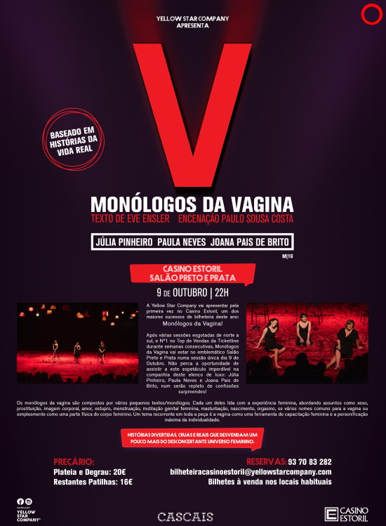 Tour Monólogos da Vagina - Paragem obrigatória quarta feira dia 9 de outubro às 22h00 Casino Estoril Salão Preto e Prata