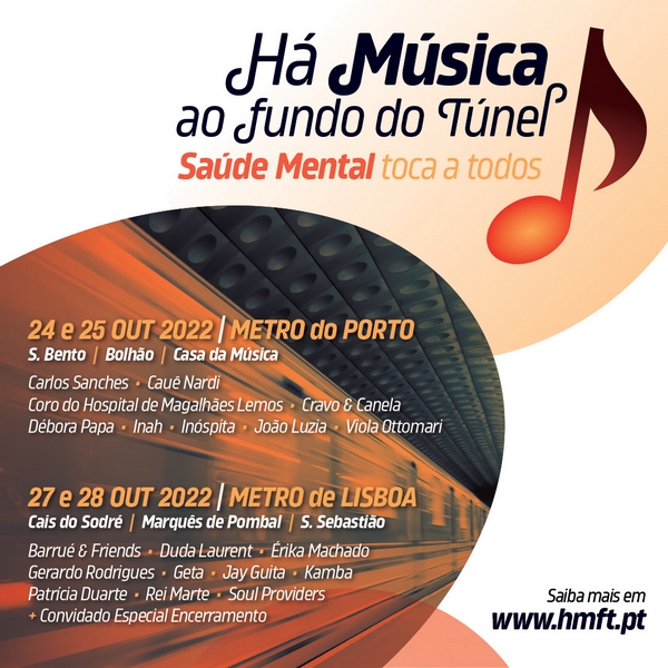 Amanhã, dia 28 de outubro às 18H00, tem lugar na Estação de Metro de S. Sebastião em Lisboa, o Evento de Encerramento da iniciativa Há Música ao Fundo do Túnel com presença e atuação do Coro do Hospital Sobral Cid, da Dra. Diana Correia, Médica de Saúde Pública que fará uma apresentação sobre a relação da Música com a Saúde Mental e da cantora AUREA num showcase especialmente dedicado à ocasião, mostrando o seu apoio a esta causa.