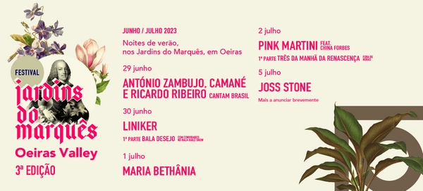 O Festival Jardins do Marquês – Oeiras Valley está de regresso para mais uma edição que promete animar uma série de noites nos jardins do Palácio Marquês de Pombal em Oeiras. O festival com mais charme do verão português aposta na qualidade da programação, com artistas consagrados e outros que garantem o presente e o futuro da música... As confirmações para a noite de 30 de junho confirmam que o festival aposta na melhor música do momento, com dois nomes que provam toda a vitalidade da música brasileira: Liniker atua nos Jardins do Marquês com uma primeira parte a cargo de Bala Desejo com convidados no seu Bala Baile Show.