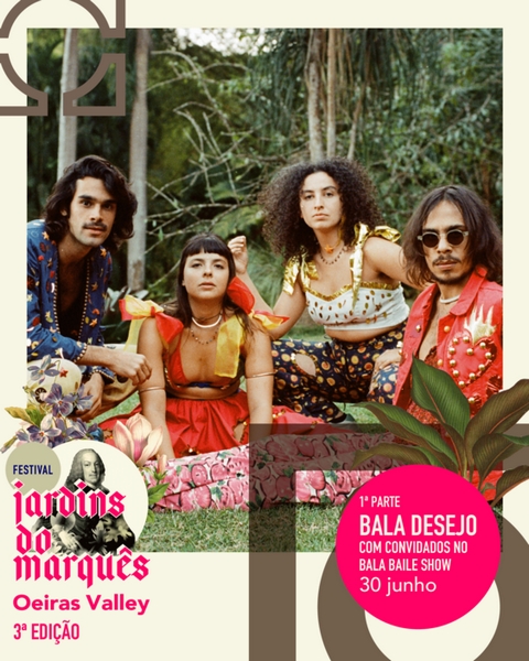 Bala Desejo é nome dado ao acontecimento-encontro dos músicos cariocas Dora Morelenbaum, Júlia Mestre, Lucas Nunes e Zé Ibarra. Amigos desde a época da escola, os quatro começaram a chamar atenção após algumas participações nas lives temáticas no Instagram da cantora Teresa Cristina. Tal movimentação culminou no lançamento do álbum de estreia do grupo, intitulado “Sim Sim Sim”. Em 2020, cada um dos músicos seguia um caminho diferente em suas respetivas carreiras musicais. Cada integrante viveu a própria solidão e processo criativo no período de isolamento. Quando decidiram morar juntos, a residência virou sinónimo de imersão, resultando em uma sonoridade que se faz nostálgica no imaginário do público, mas de vanguarda na proposta embalada… A concretização de Bala Desejo como grupo veio a partir do convite do Coala Festival para a edição de 2021, posteriormente adiada por conta da pandemia. Com a impossibilidade do evento, surgiu a ideia da gravação de um disco. “Sim Sim Sim” conquistou o público e a crítica graças a canções como “Baile de Máscara (recarnaval)” e “Lambe Lambe”. E este “recarnaval” também vai ser vivido em pleno Jardins do Marquês, dia 30 de junho, na primeira parte do concerto de Liniker. Bala Desejo regressa a Portugal e apresenta o seu Bala Baile Show. Neste formato o grupo reforça o seu convite à celebração e traz convidados para uma festa imperdível.