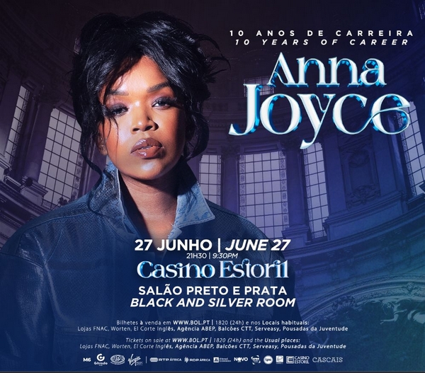 Em concerto inédito, Anna Joyce apresenta-se, no próximo dia 27 de Junho, pelas 21h30, no Salão Preto e Prata do Casino Estoril. Trata-se de um concerto especial e intimista que inicia as celebrações dos 10 anos de carreira da cantora angolana.