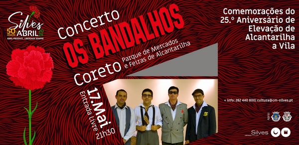 Para comemorar o 25.º Aniversário da Elevação a Vila de Alcantarilha, irá ter lugar o concerto “OS BANDALHOS”, no dia 17 de maio, pelas 21h30, no Coreto do Parque de Feiras e Mercados de Alcantarilha.