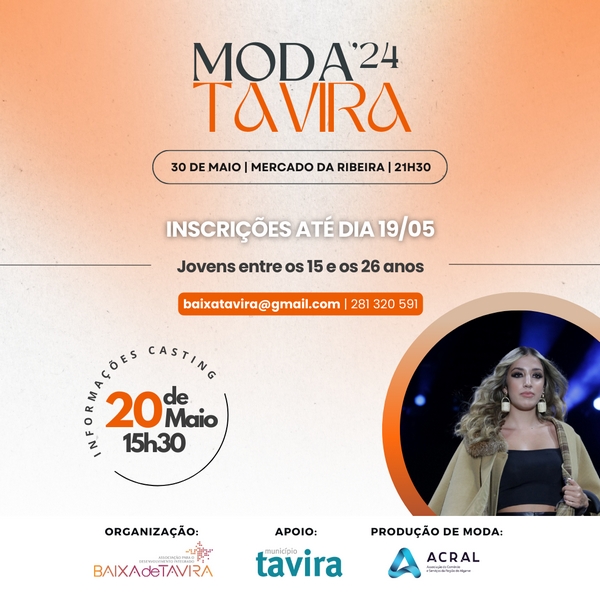 Esta iniciativa, apoiada pelo Município de Tavira, conta com a realização de um casting destinado aos jovens entre os 15 e os 26 anos, que terão a oportunidade de desfilar junto de modelos consagrados no mundo da moda.