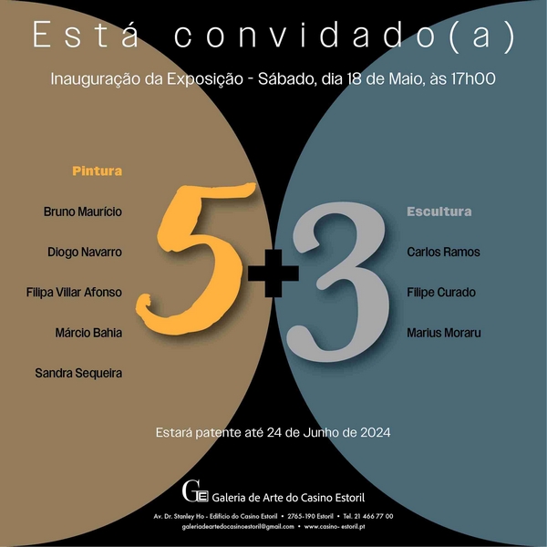 É já no próximo Sábado, 18 de Maio, pelas 17 horas, que a Galeria de Arte do Casino Estoril inaugura a exposição colectiva de pintura e de escultura intitulada de “5 + 3”. Nesta diversificada mostra estarão presentes trabalhos de 5 pintores e 3 escultores.