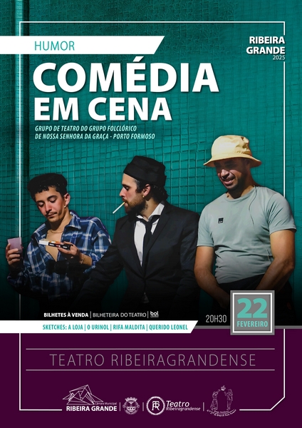 “Comédia em Cena” promete trazer ao Teatro Ribeiragrandense, no próximo dia 22 de fevereiro, muito humor e animação, com os sketches “Morto Vivo”, “Urinol”, “A Praia” e “Tropa”, através dos quais o Grupo de Teatro do Grupo Folclórico de Nossa Senhora da Graça, apesar de integrar um conjunto de atores amadores, irá demonstrar todo o seu talento e razão para o sucesso alcançado.