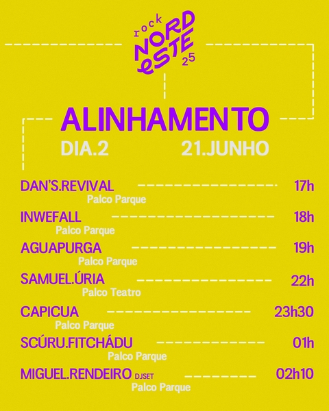 O segundo dia completa-se com Samuel Úria, que vai ocupar o palco exterior do Teatro Municipal de Vila Real, às 22h00. Já às 23h00 é a vez de Capicua, que leva o hip-hop nacional e a música de intervenção ao Parque Corgo, seguindo-se depois Scúru Fitchádu (01h00) e Miguel Rendeiro (02h10).