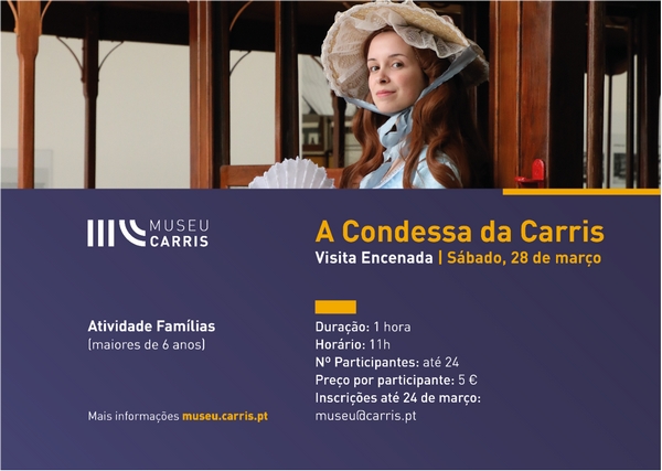As inscrições para a Visita Encenada "A Condessa da Carris" estão abertas até dia 24 de março, através do e-mail: Este endereço de email está protegido contra piratas. Necessita ativar o JavaScript para o visualizar..