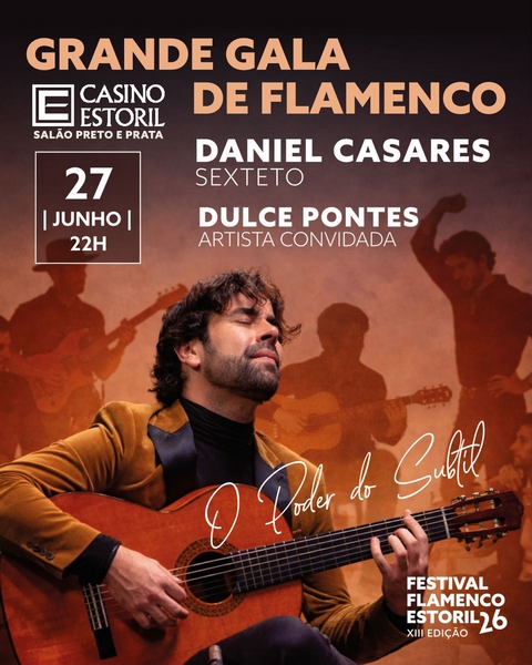 Com uma carreira brilhante que o coloca na elite do toque flamenco contemporâneo, Daniel Casares regressa aos palcos com “O poder do subtil”, apresentado como uma Grande Gala de Flamenco, onde guitarra, cante e baile se unem num espectáculo de grande intensidade artística. Dulce Pontes é a convidada especial de uma noite imperdível agendada para 27 de junho, a partir das 22 horas, no Salão Preto e Prata do Casino Estoril.