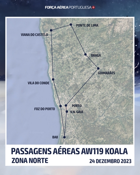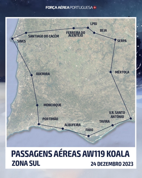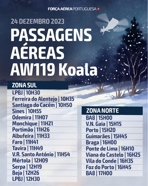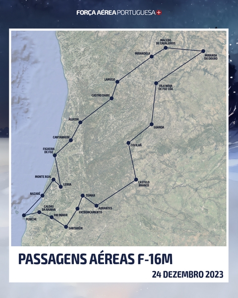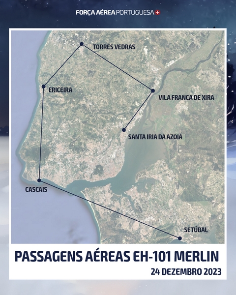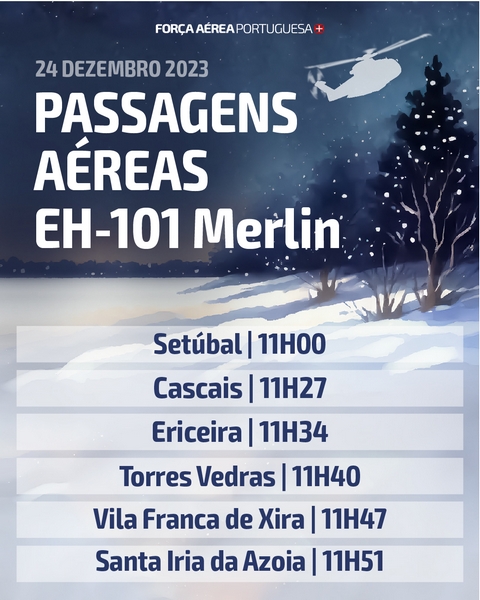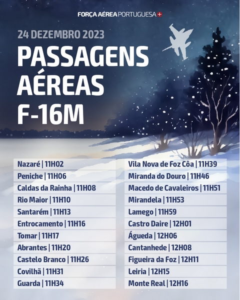 A Força Aérea, através de uma parelha de F-16M e dos helicópteros AW119 Koala e EH-101 Merlin, vai sobrevoar algumas regiões de Portugal Continental, dia 24 de dezembro, como forma de desejar a todos um Feliz Natal.