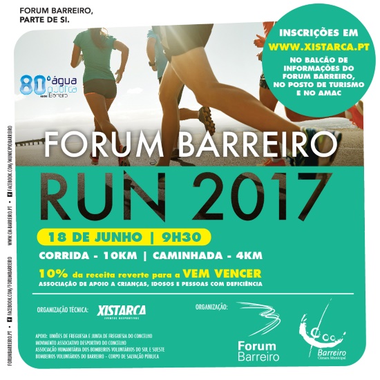 As inscrições para a Forum Barreiro Run (FBR), agendada para 18 de junho, às 9h30, mantêm-se abertas até dia 17, do seguinte modo: 2º Prazo: de 5 a 14 de junho – Corrida (10km) 10€ - Caminhada (4km) 7€; Última Hora: 16 de junho – Na Xistarca (14h00/18h30) | 17 de junho no Forum Barreiro (14h00/20h00).