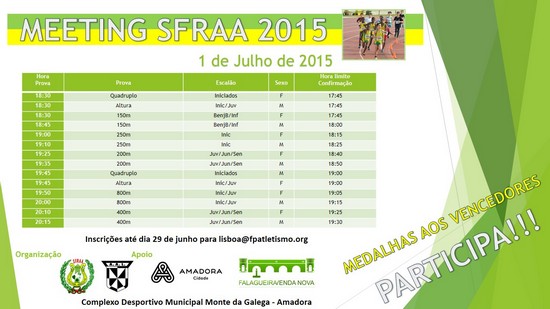 No âmbito da promoção do atletismo de pista na Amadora, realiza-se no dia 1 de julho de 2015, na Pista de Atletismo do Complexo Desportivo Municipal do Monte da Galega, o Meeting de Atletismo da Sociedade Filarmónica de Apoio Social Recreio Artístico da Amadora.