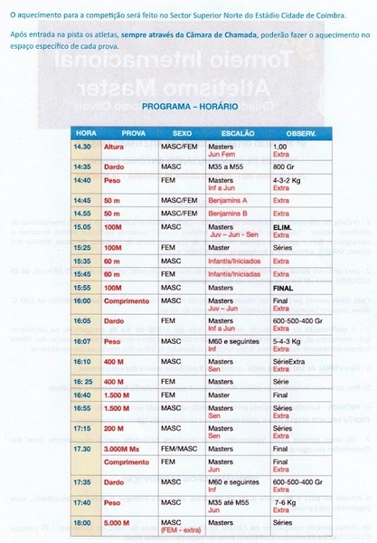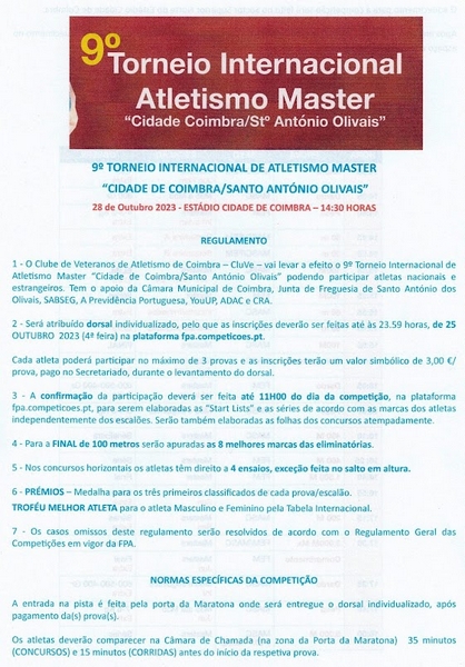 Está em... início Atletismo Pista 9º Torneio Internacional Atletismo Master "Cidade Coimbra / Stº António Olivais" - Nova Data