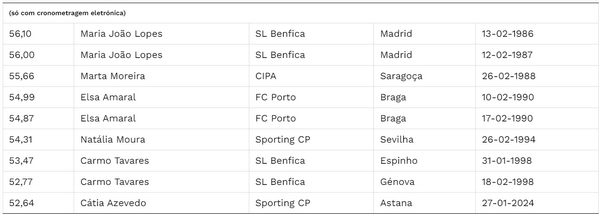 Evolução do recorde de Portugal dos 400 metros femininos em pista curta
