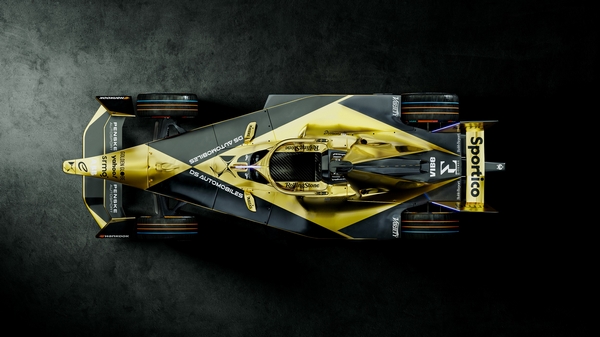 O vistoso monolugar da série 100% elétrica aumenta ainda mais o seu esplendor, elegância e visibilidade, invertendo as suas reconhecidas cores dourada e preta. O DS E-TENSE FE23 passa a ostentar, a partir de agora, um deslumbrante visual dourado na secção dianteira, nos painéis laterais e a revestir todo o halo.