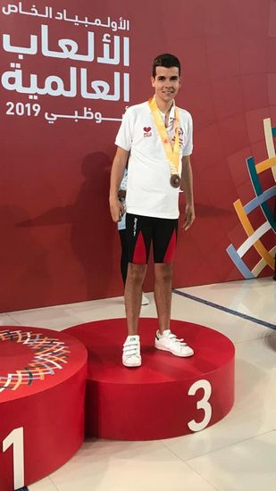 Pedro Passos, cliente e atleta da Fundação AFID Diferença no Centro de Atividades Ocupacionais (CAO) recebeu medalha de bronze nas Special Olympics World Summer Games, em Abu Dhabi.