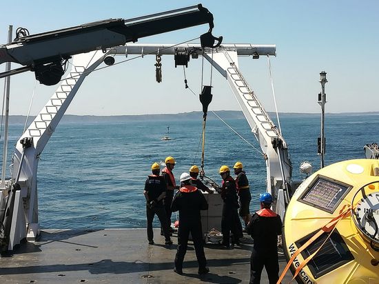 A manobra de fundear a boia foi realizada com o auxílio de uma semirrígida de bordo, dois mergulhadores e uma equipa técnica do Instituto Hidrográfico.