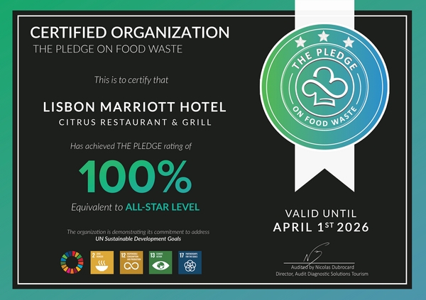 O CITRUS Restaurante, do Lisbon Marriott Hotel, conquista um marco inédito em Portugal: é o primeiro restaurante do país a ser distinguido com a certificação internacional “The PLEDGE on Food Waste”.Este reconhecimento a nível global, comprova o forte compromisso do Lisbon Marriott com a redução do desperdicio alimentar, a sensibilização da equipa e dos consumidores e a promoção de uma restauração mais sustentável.