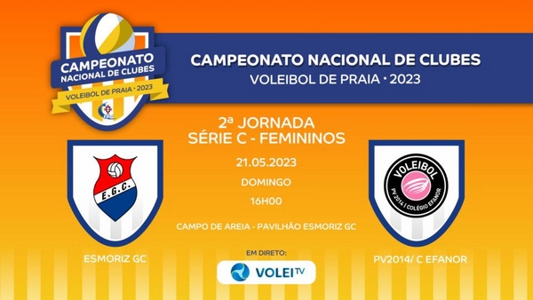 O Esmoriz Ginásio Clube x PV 2014/Academia de Voleibol Colégio Efanor, relativo à 2.ª jornada da 1.ª Fase, Série C, do Campeonato Nacional de Voleibol de Praia de Clubes 2023 – Femininos, vai ser transmitido em directo pela Volei TV.