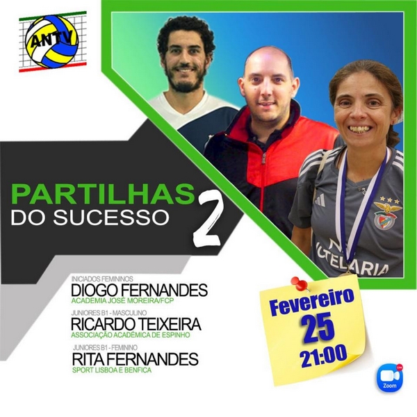 A Associação Nacional de Treinadores de Voleibol (ANTV) organiza no dia 25 de Fevereiro a quarta e última sessão das «Partilhas do Sucesso II», que terá como convidados os treinadores Rita Fernandes (SL Benfica), Ricardo Teixeira (AA Espinho) e Diogo Fernandes (AJM/FC Porto), respectivamente campeões nacionais de Juniores B1 femininos, Juniores B1 masculinos e Iniciados femininos na época de 2022/2023, que partilharão as experiências, sucessos, dificuldades e opções que marcaram o seu trabalho e que contribuíram para o êxito alcançado.