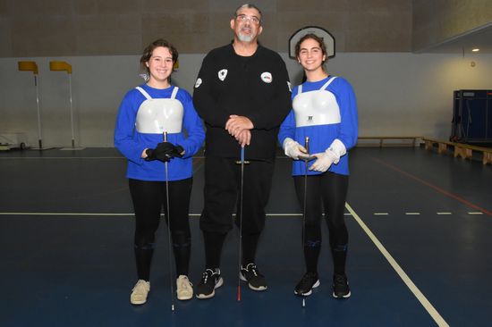 Mestre Fernando Brecha com duas alunas e a arma o florete