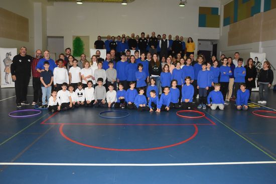 Foto com o Mestre, instrutores, praticantes, pais, (todos os intervenientes) antes do início da aula